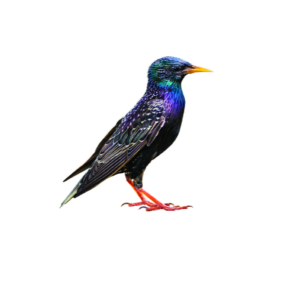 Adult European starlings are about 7 ½ to 8 ½ inches long. They are stocky, short-tailed, and sport a long slender bill (a feature that distinguishes them from most other blackbirds). Starling plumage varies throughout the season. In spring and summer, European starlings are black with an iridescent green-purple sheen and yellow bill. In winter, however, their plumage becomes heavily speckled, and their bills become dark in color. Typically, starlings have two short legs, each bearing one rear-facing and three forward-facing toes. Juveniles appear somewhat different than their adult counterparts, with dull brown or greyish feathers and darker, almost black beaks. They are often mistaken for other bird species.