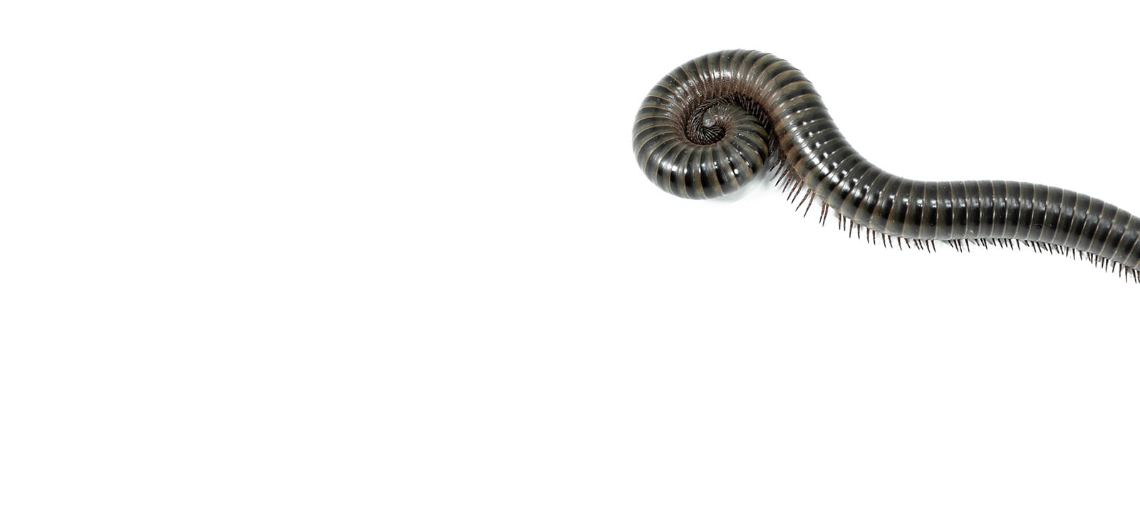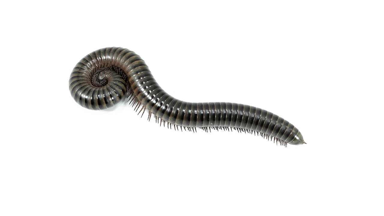 The millipede is typically brownish or blackish, worm-like creature with 30-90+ very short legs. Some species are flat, but each millipede has two pairs of legs attached to each body segment (except at few segments at both body ends). They range in size from 2-115 mm (1/16 – 4½ inch) long. Millipedes curl up tightly when touched, or after it dies.
